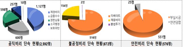적발된 2592명의 공직비리 사범 중엔 재정비리가 1127명으로 가장 많았고 금품 수수를 하다 붙잡힌 인원이 600명으로 뒤를 이었다. 권한 남용은 598명, 소극행정은 257명, 제보자보호 위반 10명 등으로 나타났다. 불공정비리 분야에선 불법 리베이트가 516명, 채용비리 154명, 불법투기 2명 순이었다. 안전비리 분야에선 부실시공이 551명으로 가장 많았다.