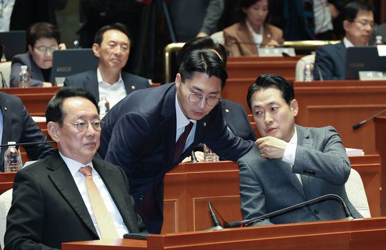 장동혁 국민의힘 대표(오른쪽)가 13일 국회에서 열린 의원총회에서 박준태 당대표 비서실장과 대화하고 있다. 왼쪽은 김도읍 정책위의장. 임현동 기자 |