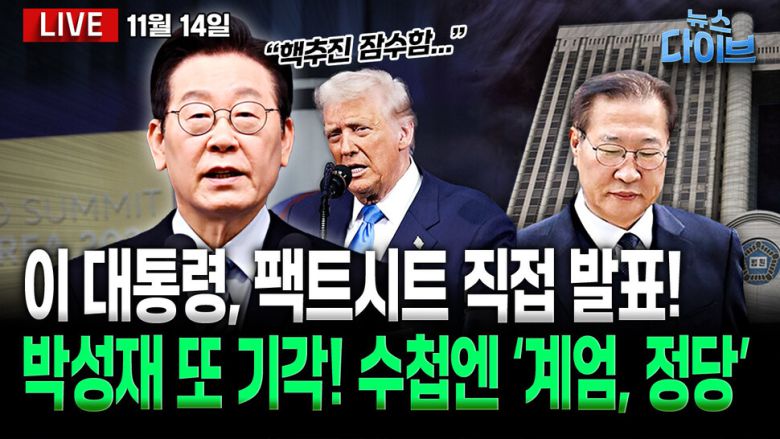 출연: 노영희 변호사, 장윤미 변호사, 김완 한겨레21 취재2팀 팀장, 진행: 고현준. 이재명 대통령, 한-미 ‘팩트시트’ 직접 발표 / ‘계엄 정당화’ 논리 작성 정황... 박성재 영장 왜 또 기각? / 김건희, 박성재에 ‘이원석 항의성 수사’ 지라시 전달 / 정영학 녹취 조작 정황... 대장동 수사 ‘조작 의혹’ 짙어졌다 / 12.3 때 윤-추경호 통화, 조지호·박안수·김용현 다음이었다 / 오늘 (11월 14일) 뉴스 다이브 많은 시청바랍니다.