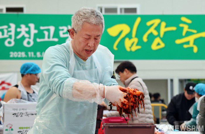 [서울=뉴스핌] 양윤모 기자 = 14일 강원 평창군 진부면민체육공원에서 개막한 '제8회 평창고랭지김장축제'를 방문한 멋쟁이 노신사가 김장을 담그고 있다. 평창산 고랭지 배추를 비롯해 모든 식재료를 국내산으로 사용하는 평창고랭지김장축제는16일까지 진행한다. [사진=평창군청] 2025.11.14 yym58@newspim.com |