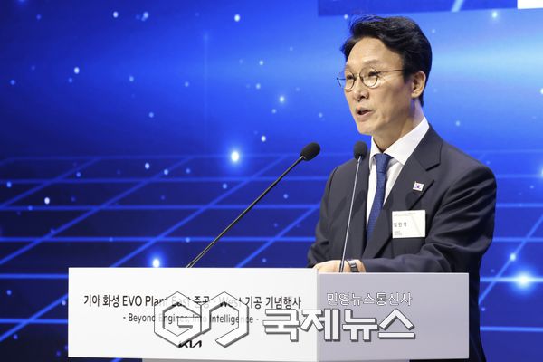 (화성=국제뉴스) 민웅기 기자 = 김민석 국무총리가 14일 경기 화성시 우정읍 기아오토랜드 화성에서 열린 기아 화성 EVO 플랜트 East 준공·West 기공 기념행사에 참석해 축사를 하고 있다.