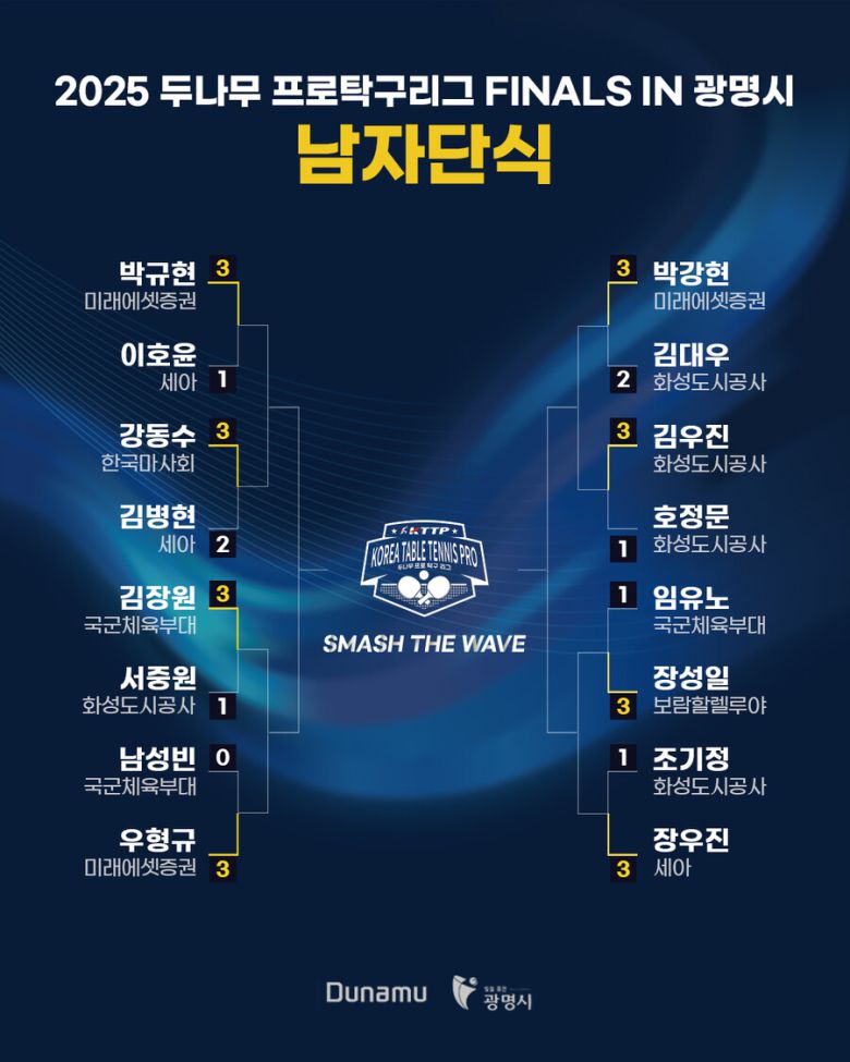 남자 단식은 박규현(미래에셋증권) VS 강동수(한국마사회), 김장원(국군체육부대) VS 우형규(미래에셋증권), 박강현(미래에셋증권) VS 김우진(화성도시공사), 장성일(보람할렐루야) VS 장우진(세아)의 대결 구도로 압축됐다.