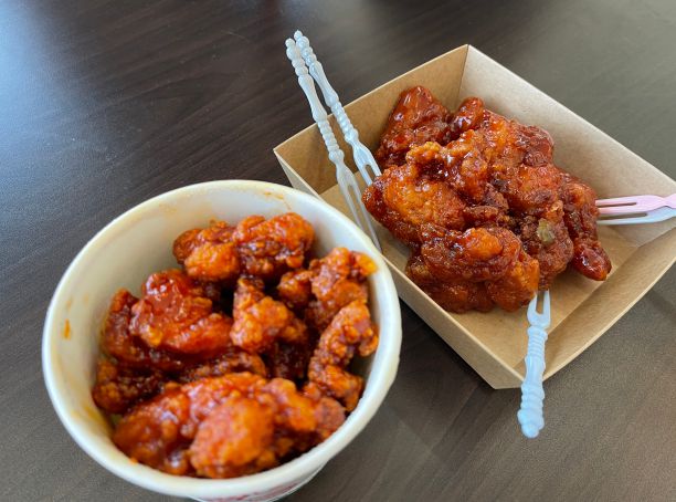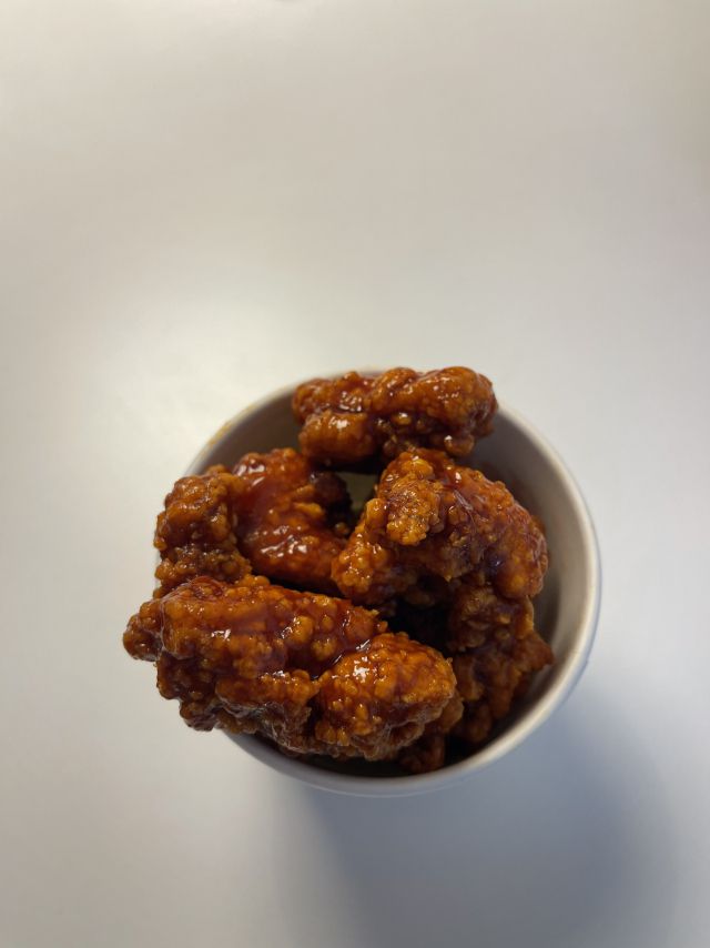 소스에 절여진 매콤한 닭강정. 퀄리티가 나쁘지 않다. 청양고추도 첨가돼있어 신경을 꽤 쓴 느낌이다. 맵찔이에게는 조금 힘든 정도의 매운 맛이 강하다.