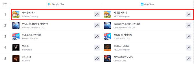 실제 시장 순위에서도 ‘메이플 키우기’는 유명 경쟁작들을 제치고 양대 앱 마켓 매출 1위에 올랐다. 넥슨은 ‘양대 마켓 1위 달성’ 이미지를 공개하며 이용자들에게 감사 인사를 전했다.