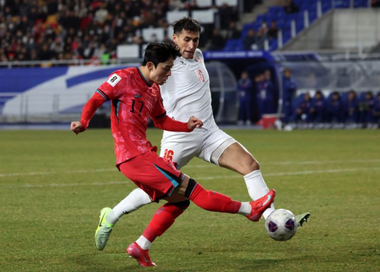 한국 vs 요르단 전에서 플레이하고 있는 양민혁.뉴스1