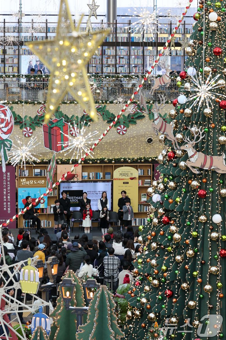 (서울=뉴스1) 안은나 기자 = 뮤지컬 배우 리사(Lisa), 이연경, 이경준, 한일경, 아역배우 윤도영, 최지훈, 우도연, 최예린이 16일 오후 서울 강남구 코엑스 별마당 도서관에서 열린 서울시뮤지컬단 '크리스마스 캐럴' 토크 콘서트에서 주요 넘버를 선보이고 있다. 영국의 대문호 찰스 디킨스가 집필한 구두쇠 '스크루지'의 이야기를 다룬 가족 뮤지컬 '크리스마스 캐럴'은 내달 5일부터 세종문화회관 M씨어터에서 초연한다. 2025.11.16/뉴스1