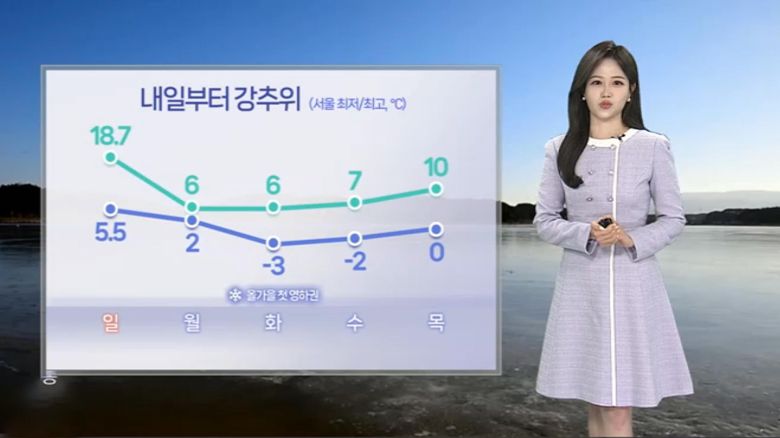 추위 속 모레는 전북 서해안과 호남 내륙에 첫눈이 내릴 가능성이 있겠고요.