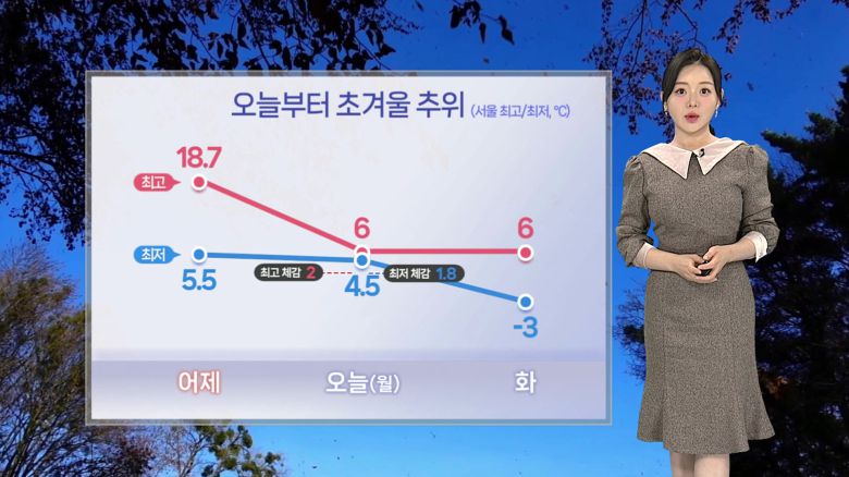 서울 등 전국 곳곳에서 어제보다 기온이 15도 이상 뚝 떨어지면서 날씨가 초겨울로 급변하겠습니다.