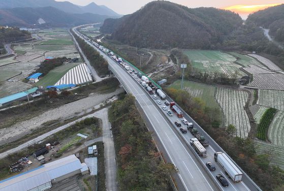 17일 오전 발생한 사고로 상주영천고속도로 양방향이 통제되면서 고속도로에 차량이 줄지어 정차해 있다. 연합뉴스 |