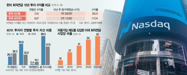 그 결과 올해 상반기 기준 미국에서는 퇴직연금 자산이 100만 달러(약 15억 원)를 넘는 ‘연금 백만장자’가 60만 명에 육박했다. 자동가입·자동적립률 상향 등 행동재무학 기반 제도 덕분에 근로자들은 별도 선택 없이도 장기 투자 구조에 들어가며 복리 효과를 자연스럽게 누렸다. 특히 미국 근로자들의 주식 비중은 20·30대가 90% 수준, 은퇴를 앞둔 60대도 절반 이상을 유지하는 것으로 알려졌다. 최근 몇 년간의 미국 증시 고공 행진 수혜를 그대로 입은 셈이다.