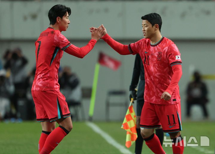 [서울=뉴시스] 황준선 기자 = 18일 오후 서울 마포구 서울월드컵경기장에서 열린 축구 국가대표팀 평가전 대한민국과 가나의 경기, 후반 한국 손흥민이 황희찬과 교체되며 인사를 나누고 있다. 2025.11.18. hwang@newsis.com