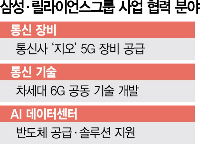 두 총수는 5세대(5G) 통신장비 공급 확대와 6세대(6G) 기술 개발 공조 방안을 집중적으로 협의할 것으로 알려졌다. AI 분야에서의 포괄적 협력 방안도 테이블 위에 오를 것으로 전망된다. 릴라이언스그룹은 석유화학을 비롯해 철강과 통신 및 유통 등 다양한 산업군을 거느린 거대 기업 집단이다.