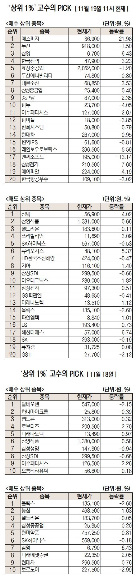 이날 미래에셋증권에 따르면 미래에셋증권 주식 거래 고객 중 최근 1개월간 투자 수익률 상위 1%에 해당하는 ‘주식 초고수’들이 오전 11시까지 가장 많이 사들인 종목은 에스피지다.