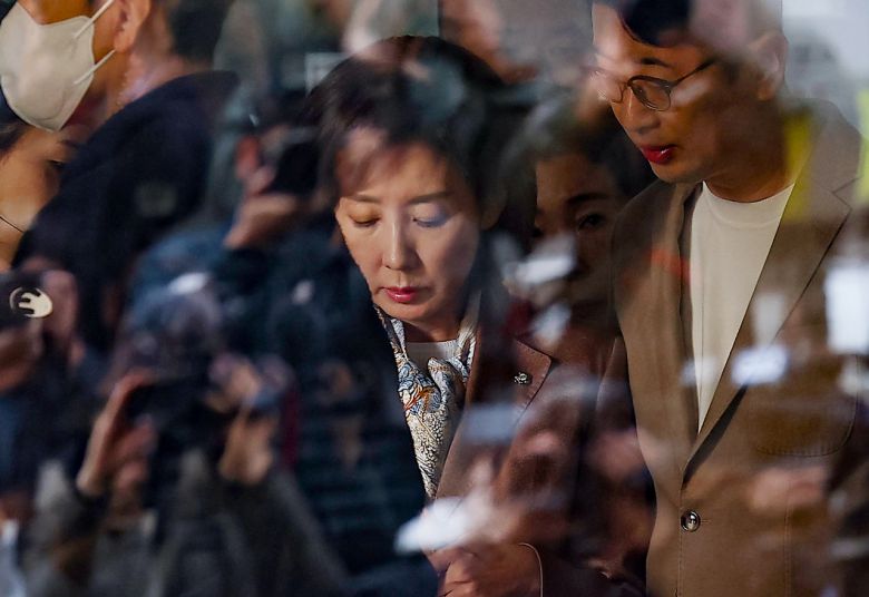 국민의힘 나경원 의원이 20일 서울 양천구 서울남부지방법원에서 열린 ‘국회 패스트트랙 충돌’ 1심 선고 공판을 마친 후 나서고 있다. [연합]