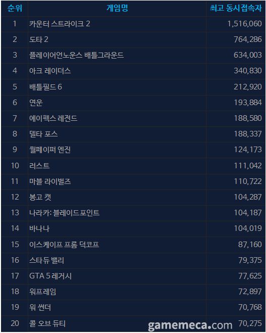 일 최고 동시접속자 TOP 20에서는 연운이 19만 3,884명으로 평일에도 최고 기록을 달성하며 델타 포스와 에이펙스 레전드를 제치고 6위로 상승했다. 이어 워 썬더가 이벤트 차량을 추가하며 7만 768명을 기록하며 19위에 올랐다.