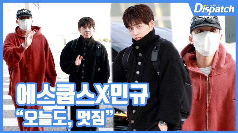 이날 민규는 레드 트레이닝 셋업, 에스쿱스는 블랙 재킷을 매치한 올블랙 룩으로 각자의 힙한 자태를 뽐냈다.