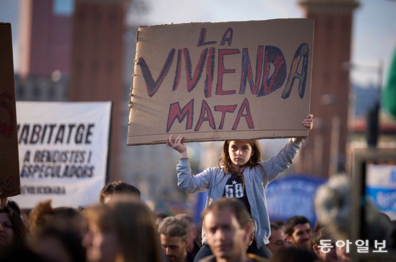 스페인 바르셀로나에서 2025년 4월 5일 높은 주택 임대료에 항의하는 시위가 벌어지고 있다. 한 소녀가 ‘주거 살인’이란 팻말을 들고 있다. AP 뉴시스 |
