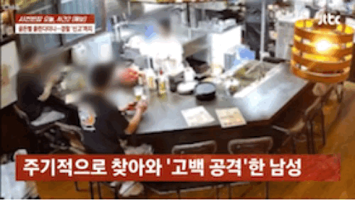 21일 전파를 탄 JTBC '사건반장'에 따르면 청주의 한 술집에서 50대 남성 A씨가 30대 여사장 B씨에게 지속적으로 '고백 공격'을 하며 영업을 방해해왔다.