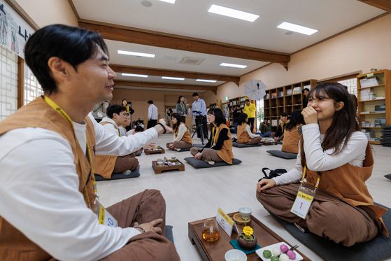 ‘나는 절로’ 참가자들이 수덕사 심연당에서 차를 마시며 웃음꽃을 피우고 있다. 김정훈 기자 |