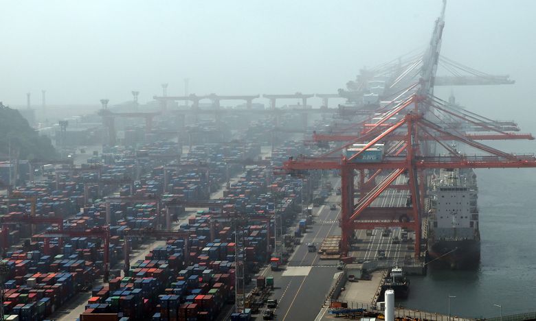 부산 남구 신선대부두 야적장에 수출입 컨테이너가 쌓여 있다. 뉴시스 |