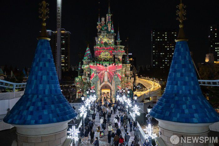[서울=뉴스핌] 롯데월드 어드벤처가 지난 22일부터 내년 3월 2일까지 인기 애니메이션 '프린세스 캐치! 티니핑'과 함께하는 겨울 시즌 축제 '트윙클 미라클 윈터'를 진행한다고 24일 밝혔다. 매일 오후 2시와 8시, 어드벤처 1층 퍼레이드 코스에서는 산타와 요정이 사랑을 전하는 '해피 크리스마스 퍼레이드'가 열린다. 사진은 크리스마스 시즌 맵핑 '크리스마스 판타지아' 모습. [사진=롯데월드] 2025.11.24 photo@newspim.com