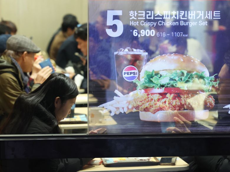 외식 물가가 치솟은 가운데 비교적 가격이 저렴한 햄버거가 주목받고 있다. 유로모니터에 따르면, 국내 햄버거 시장은 2014년 2조1000억원에서 지난해 4조2000억원으로 10년 새 두 배로 성장했다. 25일 서울의 한 패스트푸드점에서 시민들이 식사하고 있다.