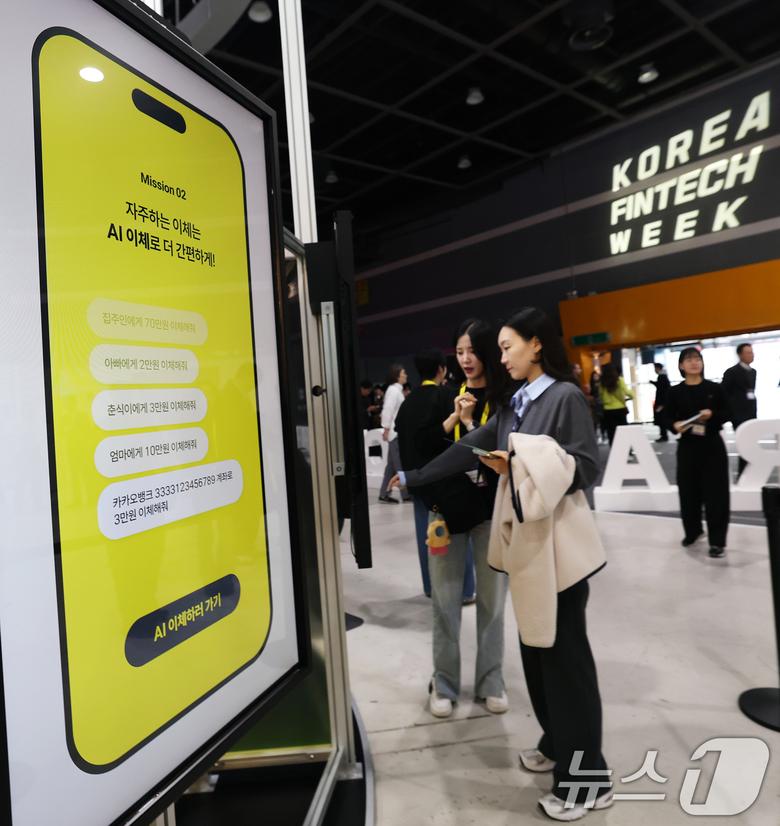 (서울=뉴스1) 오대일 기자 = 26일 서울 서초구 aT센터에서 열린 '코리아 핀테크 위크 2025' 카카오뱅크 부스에서 방문객들이 AI 활용 서비스를 체험하고 있다. '핀테크 X AI, 금융에 취향을 더하다'라는 주제로 열리는 이번 박람회는 오는 28일까지 사흘간 진행된다. 2025.11.26/뉴스1