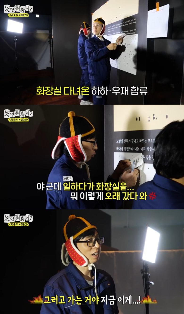 그런가 하면 유재석은 하하를 향해 "아무 생각이 없는 거다. 국중박 와서 똥이나 싸고"라며 하하의 배변 이슈(?)를 언급해 현장을 웃음바다로 만들었다. 하하가 화장실을 다녀왔을 때도 유재석은 "왜 이렇게 오래 다녀오냐"고 짚었던 바.