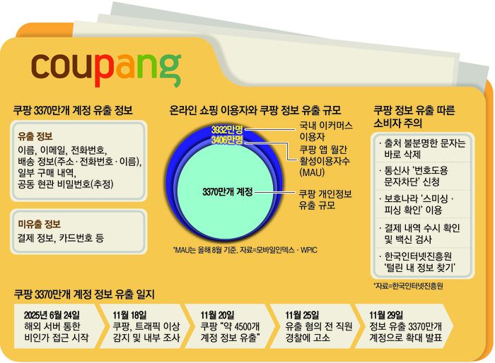 국내 최대 이커머스 플랫폼 쿠팡에서 계정 3370만개의 이름·전화번호·이메일·주소 등 민감한 개인정보가 유출되면서 이들 자료가 보이스피싱·스미싱에 악용될 수 있다는 염려가 커지고 있다. 중국 국적 전 직원이 지난 6월 24일부터 해외 서버를 통해 정보를 유출한 것으로 추정되는 가운데, 쿠팡이 5개월여 동안 이를 몰랐다는 데 대해 ‘안일한 보안 의식’이라는 비판이 쏟아지고 있다. 또 쿠팡이 지난 11월 18일 유출 계정이 4500여 건이라고 밝혔다가 이 수치가 7500배로 늘어난 점이나 민감한 정보가 흘러나가 보이스피싱 등에 악용될 우려가 있는 데도 “고객 여러분은 계정 관련 조치를 취할 필요가 없다”고 안내하는 점 등에 대해서도 사태를 과소평가한다는 비난이 나오고 있다.