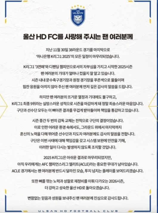 울산은 2일 입장문을 발표했다. 울산은 “팬 여러분의 뜨거운 열정과 기대에도 K리그1 최종 9위라는 실망스러운 성적으로 시즌을 마감하게 돼 정말 죄송스러운 마음이다. 구단과 선수단 모두 뼈아픈 결과를 무겁게 받아들이며 책임을 통감하고 있다”고 반성했다.