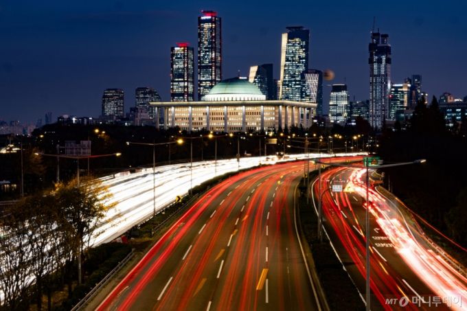 1년 전 12월 3일, 비상계엄으로 국회가 봉쇄되며 민주주의의 심장이 멈췄다. 촛불 시민들은 장갑차를 막아섰고, 국회의원들은 담벼락을 넘어 본회의장을 향했다. 헌법을 짓밟으려던 시도는 민주주의 시민들의 힘으로 무너졌다. 암흑 같던 계엄령은 역사로 남았다. 그 어둠 속에서 깨어난 우리는 한걸음씩 민주주의를 향해 나아간다. 국회의사당을 에둘러가는 차량들의 환한 불빛처럼. / 사진=뉴스1 |