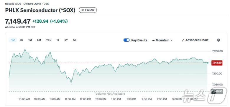 2일(현지 시각) 뉴욕증시에서 반도체지수는 1.84% 상승한 7149.47포인트를 기록했다.