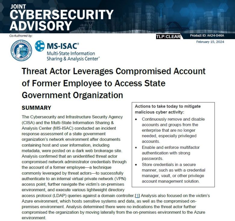 3일 보안 업계에 따르면, CISA는 지난해 2월 사이버 경보 보고서(AA24-046A)를 통해 ‘퇴사자 계정을 이용한 주(州)정부 해킹 사례’ 분석 결과를 내놨다. 한 주정부 기관의 전직 직원 계정을 이용해 서버에 접속, 데이터를 추출한 뒤 수집된 정보를 다크웹에 판매한 것으로 드러났다.