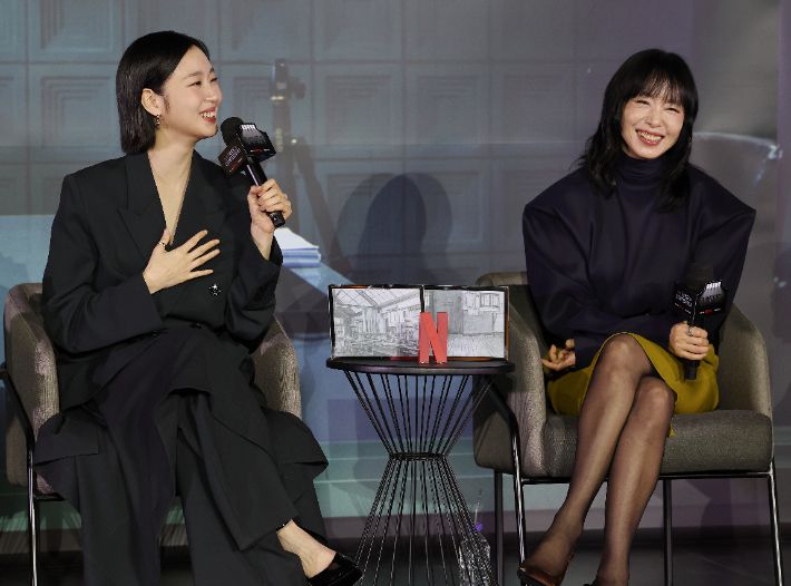 배우 김고은(왼쪽)과 전도연이 3일 서울 CGV 용산아이파크몰점에서 열린 넷플릭스 시리즈 '자백의 대가' 시사 간담회에 참석하고 있다. 연합뉴스 |