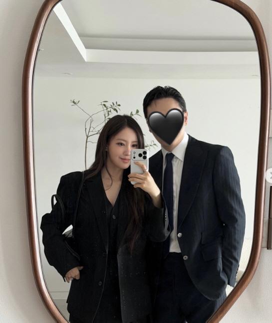 올블랙으로 맞춰 입은 효민은 마찬가지로 블랙톤으로 차려입은 남편과 다정한 모습을 자랑했다. 남편은 하트 스티커로 얼굴을 가렸지만 감출 수 없는 훈훈함으로 눈길을 끌었다.