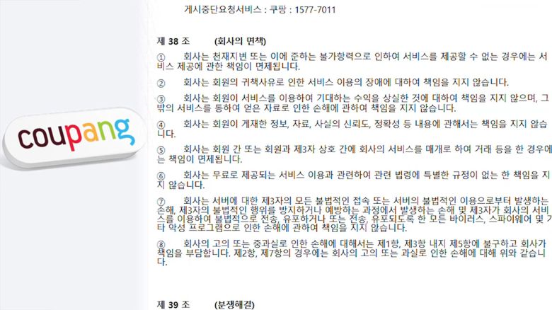 유통업계에 따르면 쿠팡은 약 1년 전 회사 이용 약관 제38조 '회사의 면책' 부분을 추가했습니다.