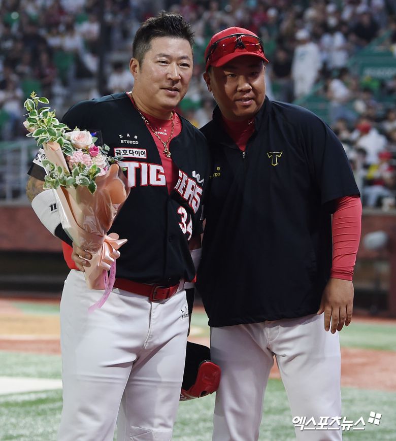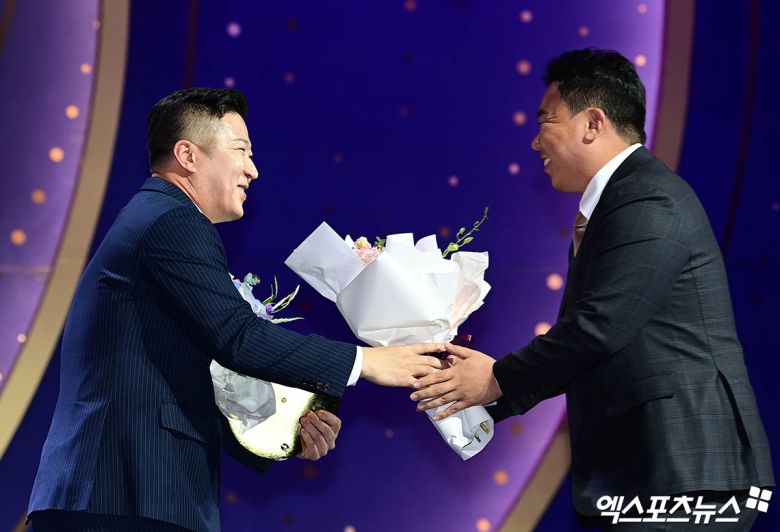 이범호 감독은 최형우에게 꽃다발을 안겨준 뒤 짧은 포옹 후 무대를 내려갔다. 지난 3일 최형우가 삼성과 FA(자유계약) 계약을 맺으면서 이제는 다른 팀 선수가 된 가운데 공식석상에서 짧게 이별 선물을 안긴 셈이었다.
