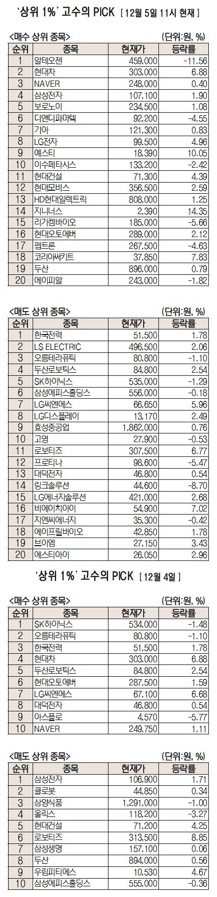 이날 미래에셋증권에 따르면 미래에셋증권 주식 거래 고객 중 최근 1개월간 투자 수익률 상위 1%에 해당하는 ‘주식 초고수’들이 오전 11시까지 가장 많이 사들인 종목은 알테오젠이다.