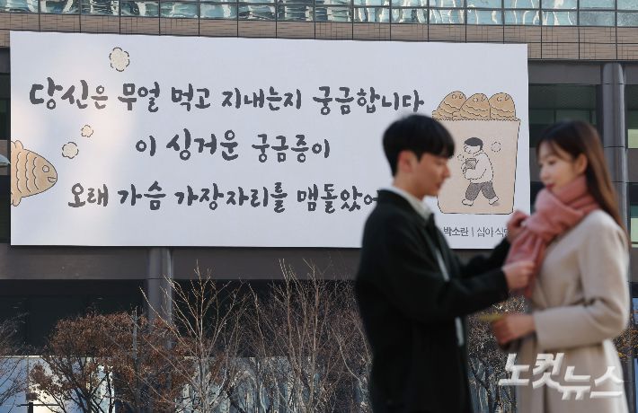 일 오전 서울 종로구 교보생명빌딩에 광화문글판 겨울편이 걸려 있다. 교보생명은 겨울을 맞아 박소란 시인의 시 '심야 식당'에서 가져온 문안으로 광화문글판을 새단장했다고 밝혔다. 류영주 기자