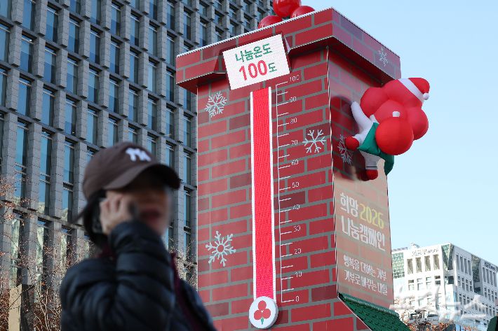 사랑의 열매 '희망2026나눔캠페인' 출범식이 열린 1일 서울 종로구 광화문광장에서 사랑의 온도탑이 점등되고 있다. 류영주 기자
