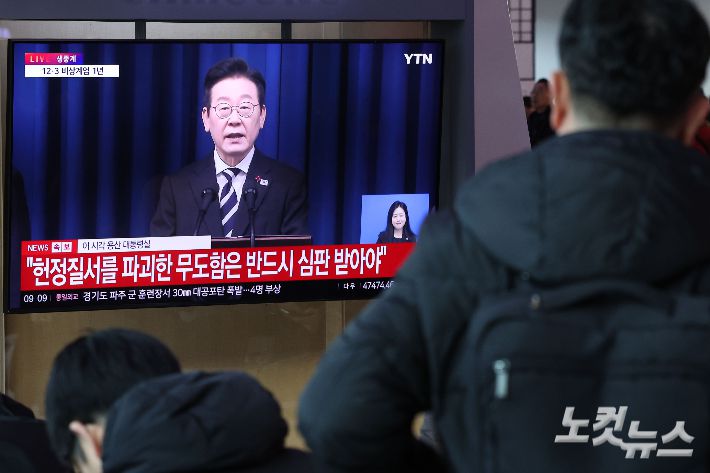 12·3 비상계엄 1년을 맞은 3일 오전 서울 중구 서울역 대합실에서 시민들이 이재명 대통령의 '빛의 혁명 1주년' 대국민 특별성명 생중계를 지켜보고 있다. 이 대통령은 쿠데타를 극복한 12월 3일을 '국민 극복의 날'로 지정하겠으며 대한국민과 함께 반드시 '빛의 혁명'을 완수하겠다고 밝혔다. 류영주 기자