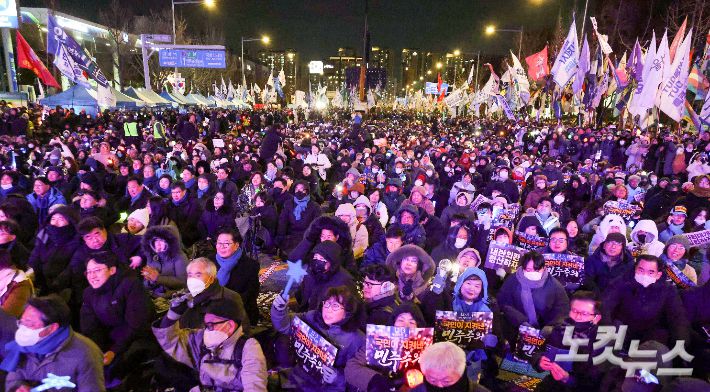 12·3 비상계엄 1년을 맞은 3일 오후 서울 영등포구 국회의사당에서 앞에서 열린 '12·3 내란·외환 청산과 종식, 사회대개혁 시민대행진' 행사에 참가한 시민들이 피켓과 응원봉을 들고 있다. 우리나라의 민주주의를 지켜낸 국민들은 비상계엄을 막아낸 지 일 년 만에 다시 모여 "여전히 내란은 현재진행형"이라며 내란외환세력 완전 청산 및 사회대개혁 완수의 목소리를 크게 높혔다. 박종민 기자