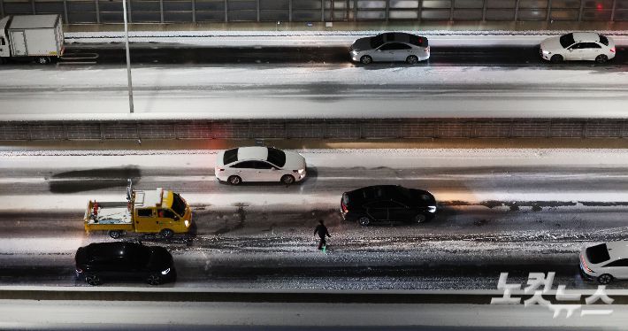 서울에 대설주의보가 내려지며 내부순환로 진입로 전 구간이 통제된 가운데 4일 서울 서대문구 홍제동에서 바라본 내부순환로에 시설관리공단 직원이 제설 작업을 하고 있다. 류영주 기자