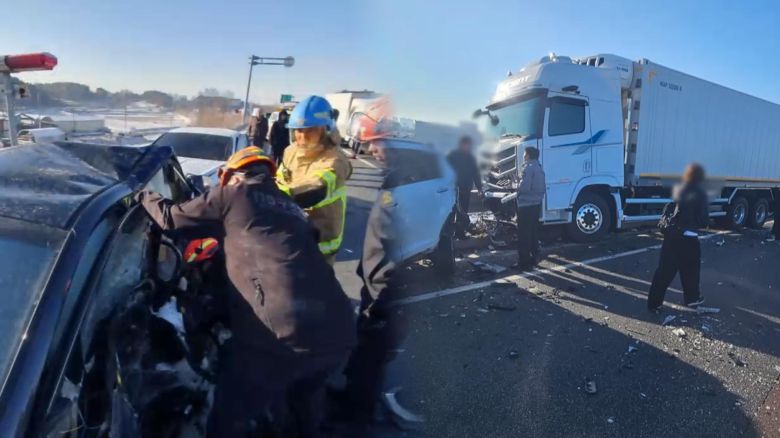 오늘(5일) 오전 9시쯤 충북 청주시 오동송 3순환로 오동분기점에서 14톤 화물차와 승용차 등 9대가 연달아 추돌했습니다.