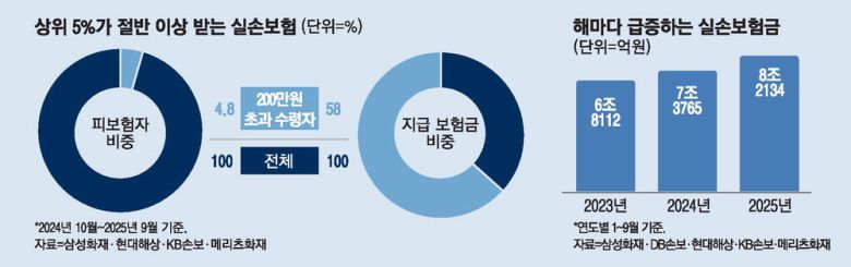 5일 삼성화재·현대해상·KB손해보험·메리츠화재 등 주요 4개 손보사에 따르면 작년 10월부터 올해 9월까지 1년간 실손보험에서 지급된 보험금은 8조8349억원이다. 이 중 연간 200만원 넘게 보험금을 타는 가입자 94만명이 1년간 받은 보험금은 총 5조1219억원에 달했다. 전체 가입자 1948만명 중 4.87%에 해당하는 고객이 전체 보험금의 58%를 받아가는 셈이다.