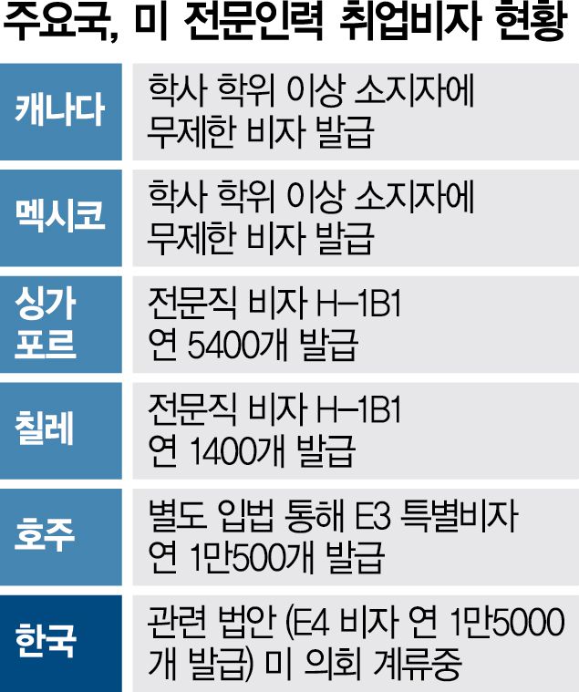 E-4 등 한국인 전용 비자 신설은 지난 십수 년간 한국 정부와 재계의 ‘숙원 과제’이기도 하다. 문제는 미국 의회의 승인을 얻어야 하는 데다 의원들이 쉽사리 나서기 어려운 상황이라는 점이다. 외국인 근로자를 달가워하지 않는 미국 유권자들의 눈치를 볼 수밖에 없어서다. 실제로 우리 정부도 로비스트를 고용하고 현지 의원들을 통해 연간 최대 1만 5000개의 E-4 비자 신설 법안을 미 의회에 발의했으나 2012년부터 진척이 없는 상태다. 캐나다·멕시코·싱가포르·호주 등 연간 비자 쿼터를 확보한 국가들은 모두 1990~2000년대 초반 사이 미국과 자유무역협정(FTA)을 체결하면서 일종의 ‘특례’를 적용받은 덕에 가능했다. 해당 특례는 미국 의회의 문제 제기로 폐지된 바 있다. 호주는 2005년 미국과 FTA를 맺는 과정에서 조지 W 부시 당시 미국 대통령이 직접 의회를 설득, 입법을 거쳐 1만 500명 규모의 전문 인력 비자 쿼터를 받은 유일한 사례다. 다만 20년이 지난 현재는 미국 내 반이민 정서가 강해진 탓에 재연되기 어려운 방식이라는 평가다. 한미 워킹그룹은 내년에도 활동을 이어가면서 향후 비자 신설, 미국 비자 관련법 개정에 관한 논의를 지속할 계획이다.