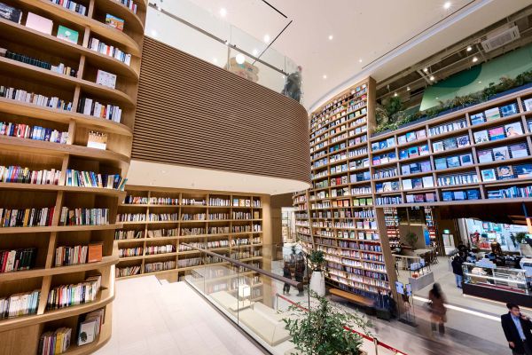 복층 서가 사이로는 '북스테어'라 불리는 계단형 라운지가 이어지고, 서가 옆에 있는 카페에서는 사람들이 책과 브런치를 즐길 수 있습니다.