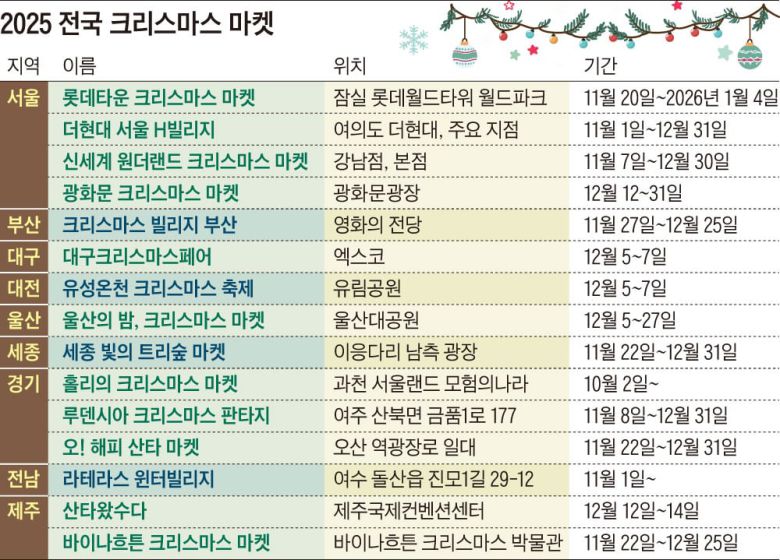 크리스마스 마켓은 잠실뿐 아니라 전국적으로 겨울을 대표하는 행사로 자리 잡고 있다. 서울과 부산·대구부터 제주까지 20개가 넘는 크리스마스 마켓이 연말을 맞아 운영되고 있거나 열릴 예정이다.<표 참조>