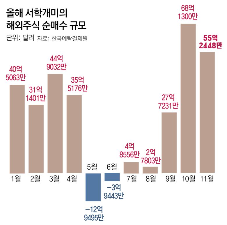 서학개미들의 해외주식 투자 규모는 날이 갈수록 커지고 있다. 한국예탁결제원에 따르면 서학개미의 해외주식 순매수는 10월 68억1300만 달러(약 9조9800억 원)로, 월별 기준 역대 최대치였다. 11월에도 55억2448만 달러(약 8조950억 원)를 사들였다. 미 증시가 인공지능(AI) 관련 기술주를 중심으로 올해 수차례 최고치를 경신하며 질주하자 서학개미들이 늘고 개인들의 투자도 늘었다.