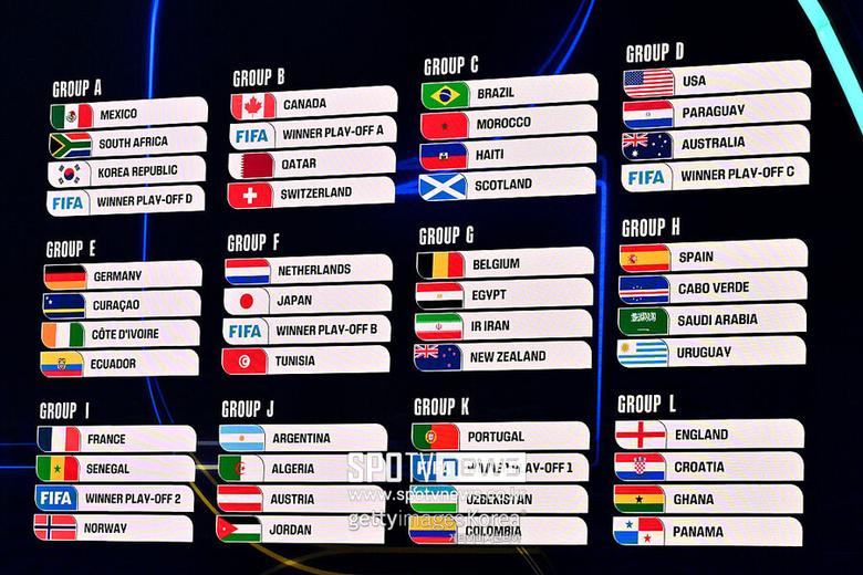 추첨 결과 한국은 개최국 멕시코(랭킹 15위), 남아프리카공화국(61위)과 함께 A조에 편성됐다. 남은 한 팀은 유럽축구연맹(UEFA) 플레이오프를 통해 합류한다. 덴마크와 체코, 아일랜드, 북마케도니아 중 한 나라가 한국의 첫 상대가 된다. 결과적으로 FIFA 랭킹 10위권 내 강호를 모두 피했다. 죽음의 조를 만들 요소였던 3포트에서도 가장 랭킹이 낮은 팀을 만나게 되면서 무난한 조 편성에 성공했다.